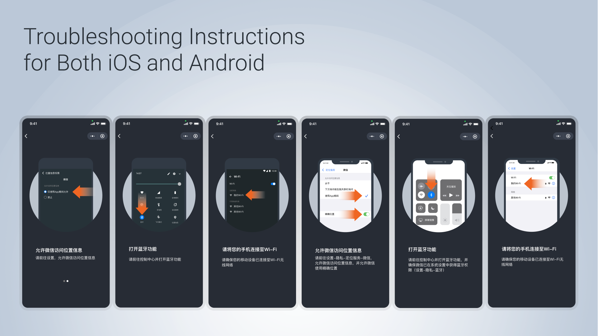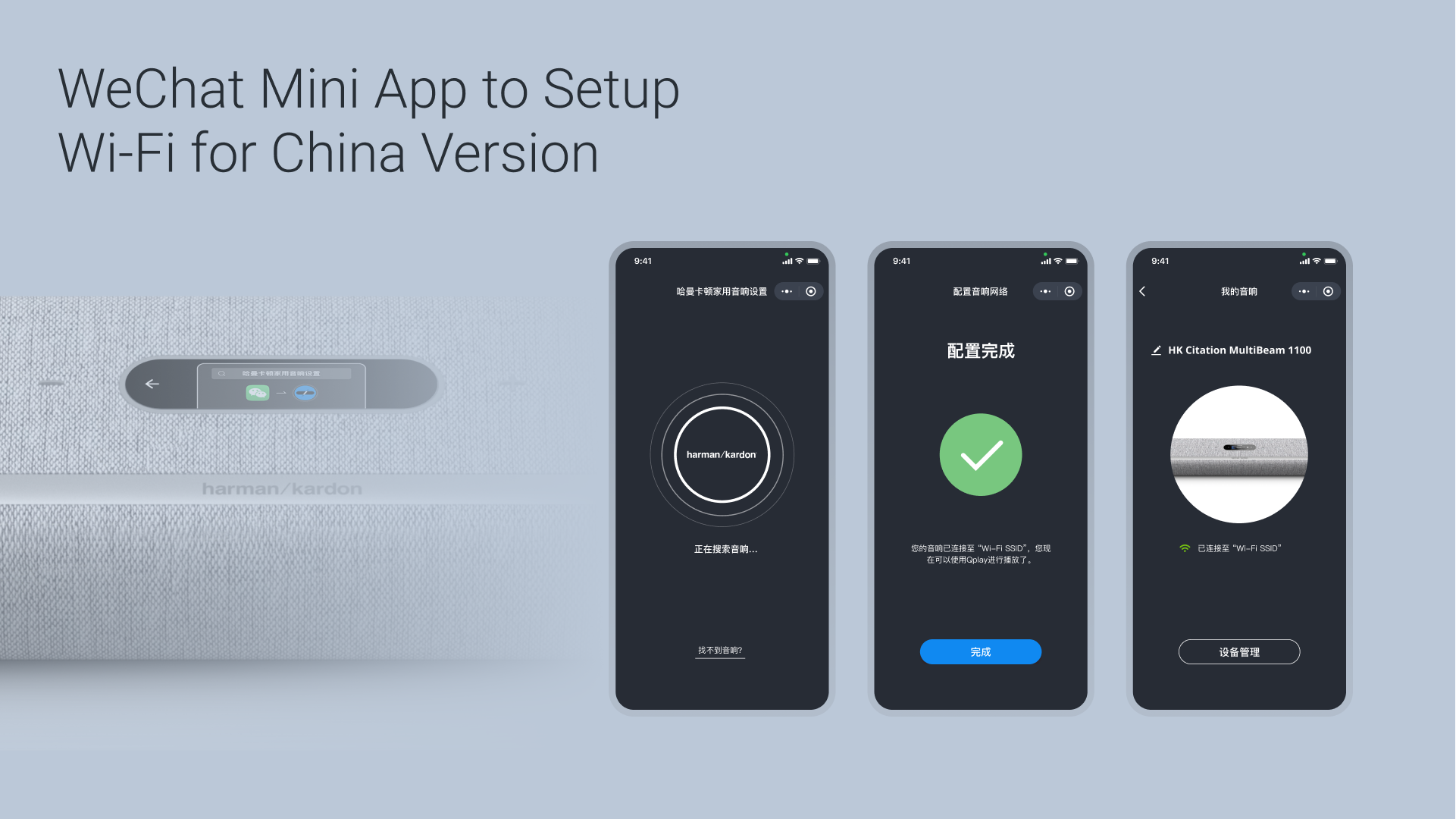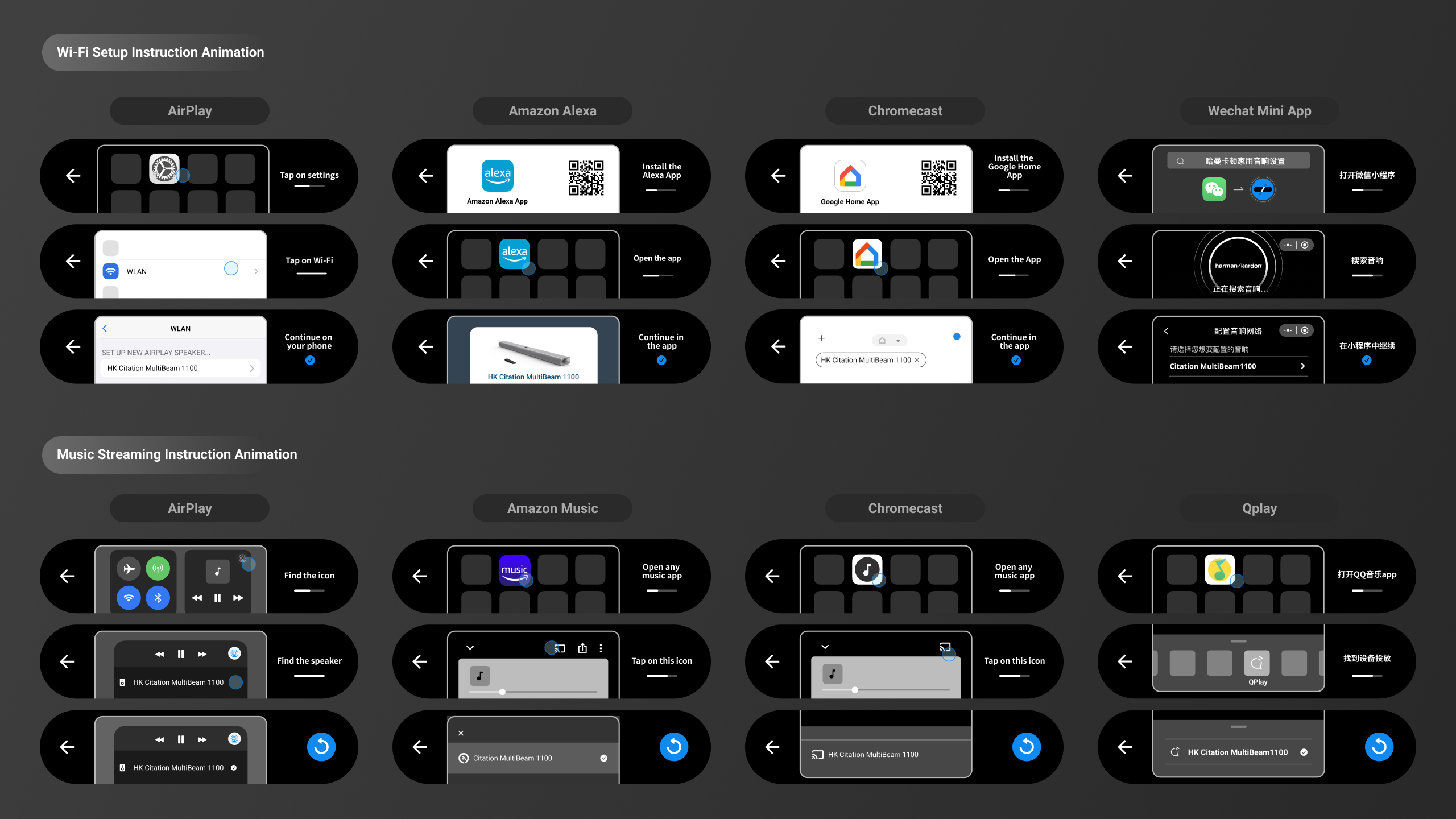 We use the animated guide to bridge the breakpoint of setup flow between our screen and the screen of the phone. We support all the major Wi-Fi music services so that users can always find one that they are familiar with.